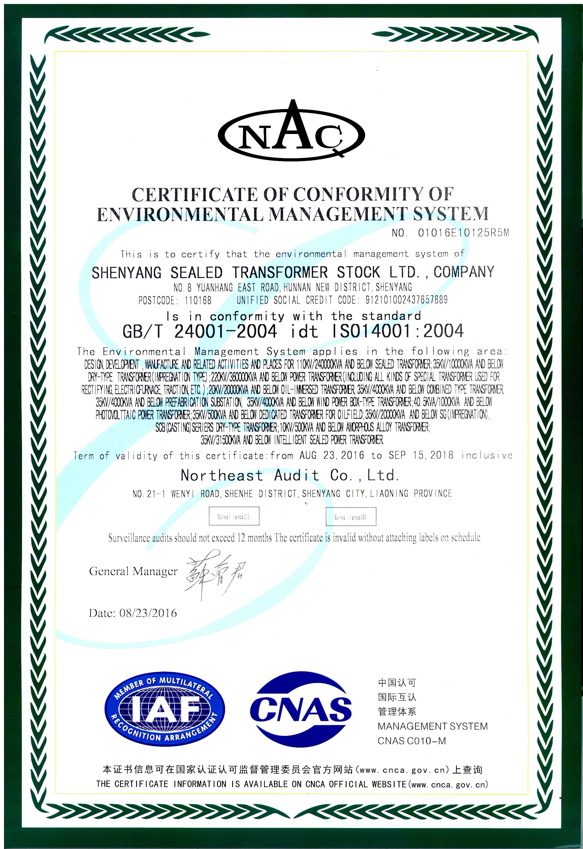 CERTIFICATE OF CONFORMITY OF ENVIRONMENTAL MANAGEMENT SYSTEM