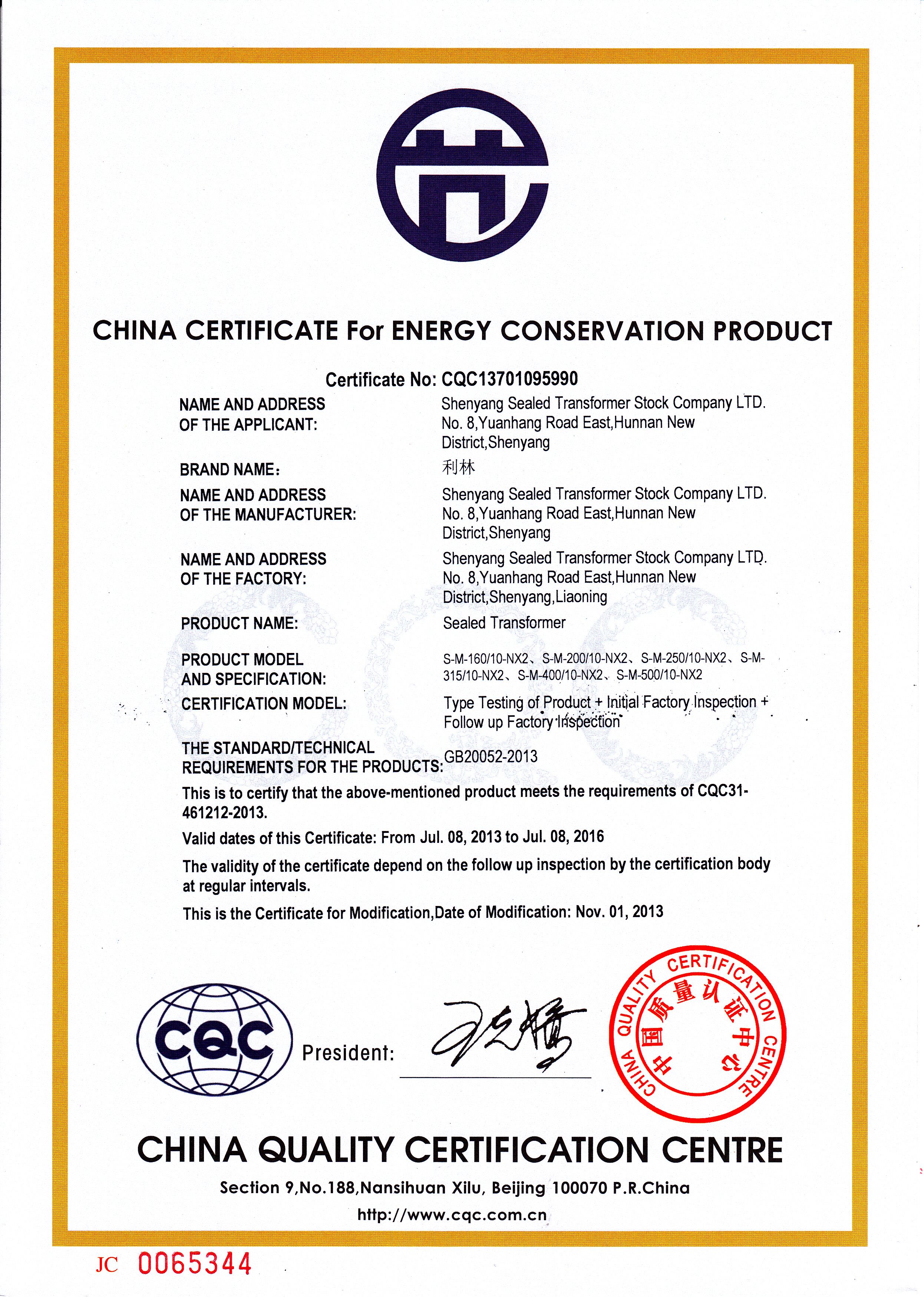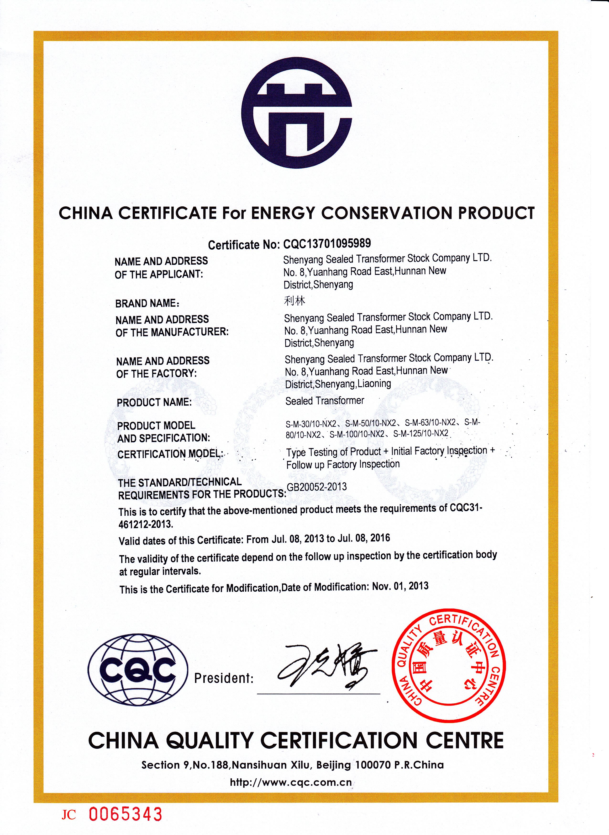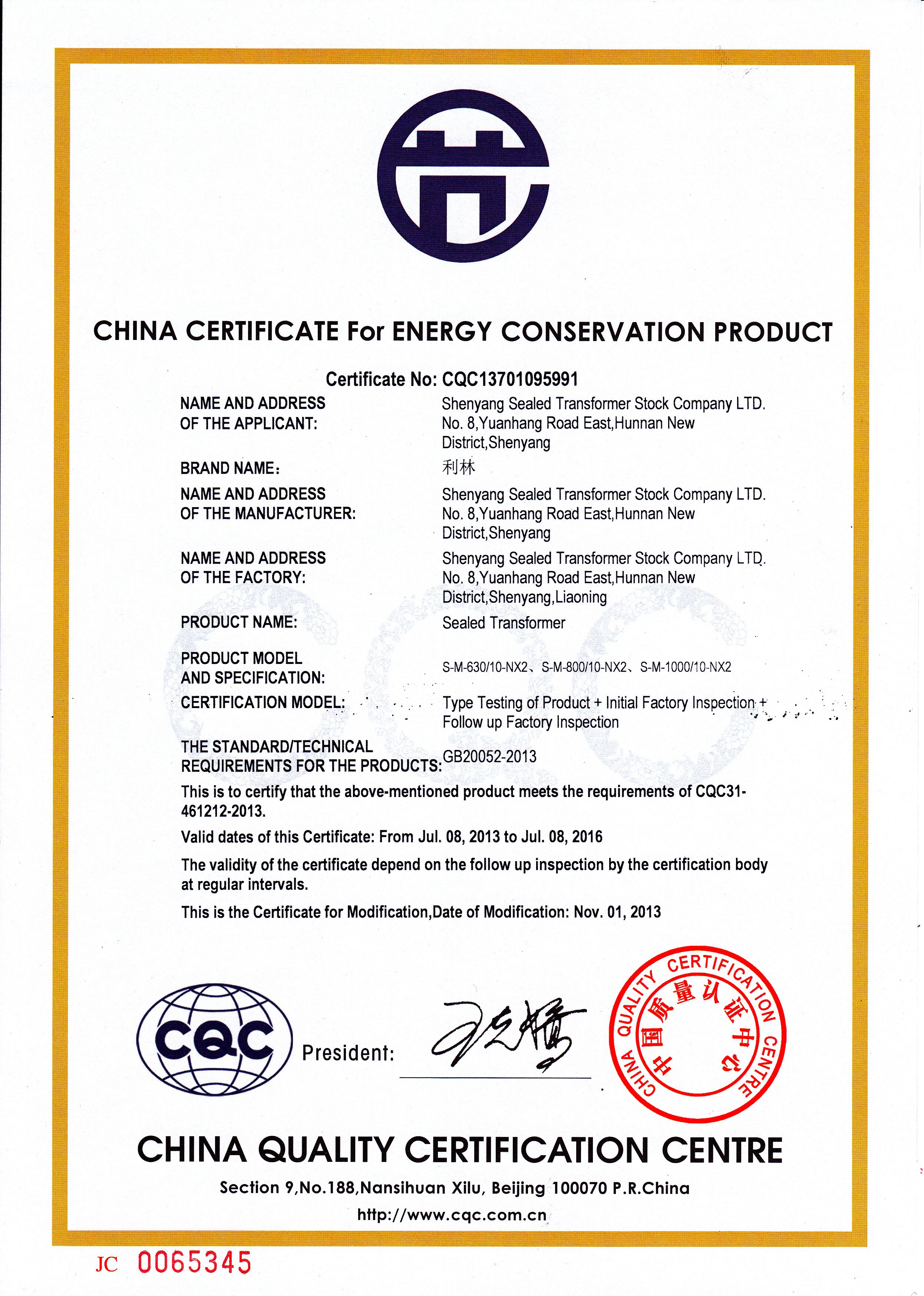 The enterprise had been gotten the Certificate of Conformity of Quality Management System, the Certificate of Conformity of Occupational Health and Safety Management System and the Certificate of Conformity of Environment Management System. For many years, the company won the national, ministerial, provincial and municipal scientific and technological progress awards, best new product awards and quality award. It is the technology pilot enterprises that support by Shenyang municipal government, is the Liaoning provincial enterprise technology center, is the AAA Grade Credit enterprise. The products had passed the type test of the Italian CESI lab, the Dutch KEMA electric power test and the National transformer quality inspection center; also get the China classification society Marine product type approval. The transformer with “Lilin” brand is named “Famous Brand in Liaoning Province”, “Famous Brand in Shenyang City”.