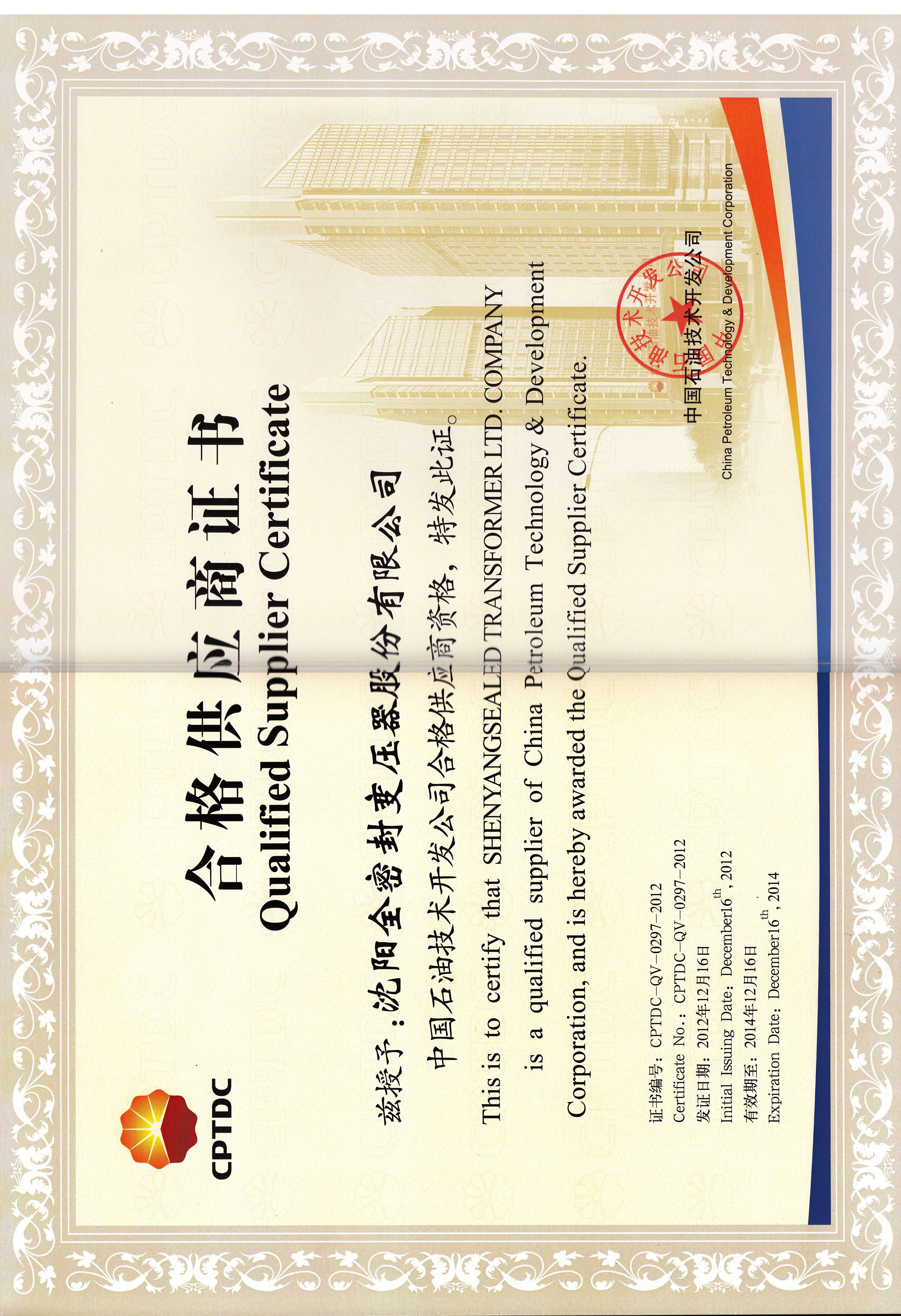 QUALIFIED SUPPLIER CERTIFICATE